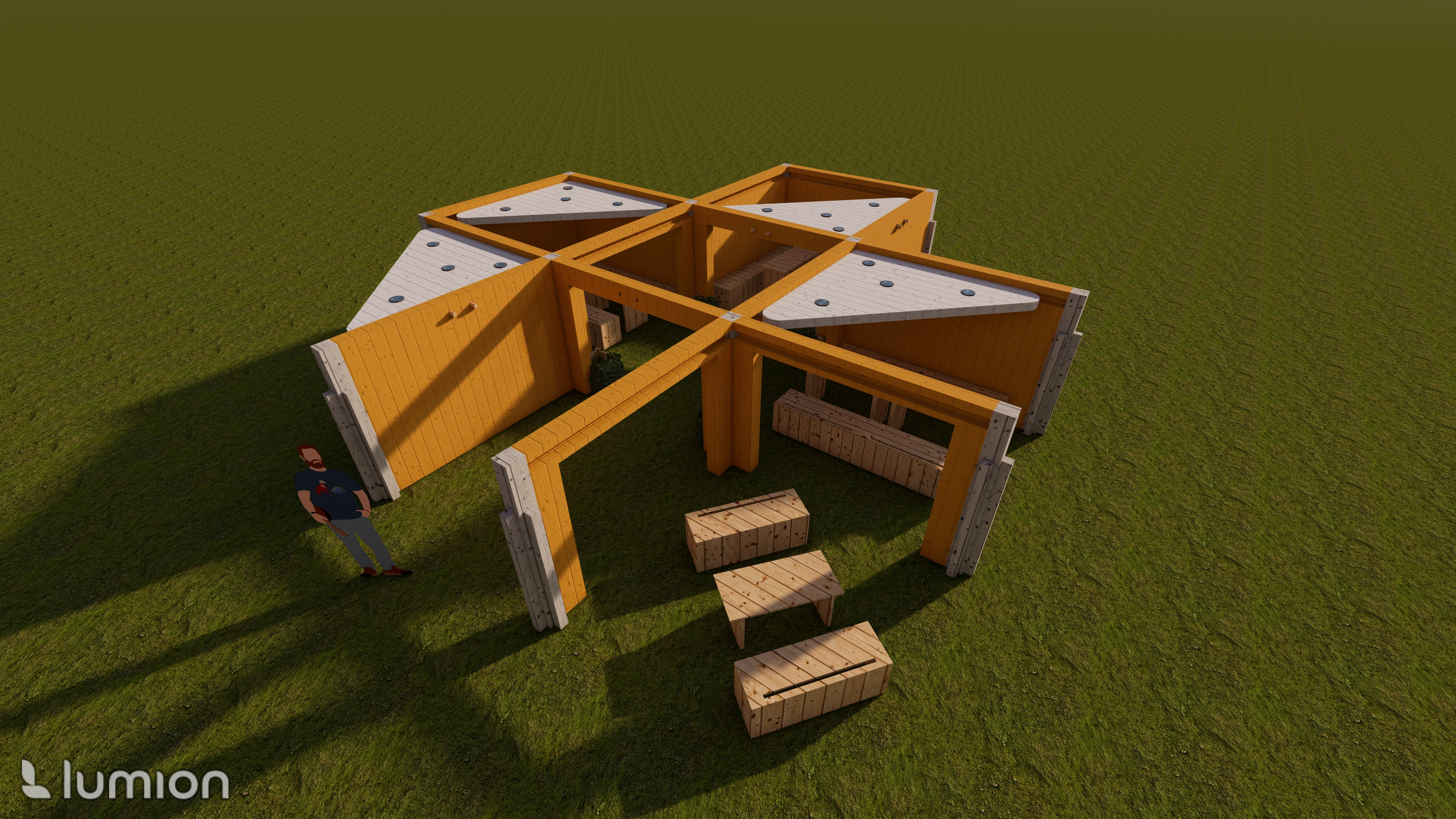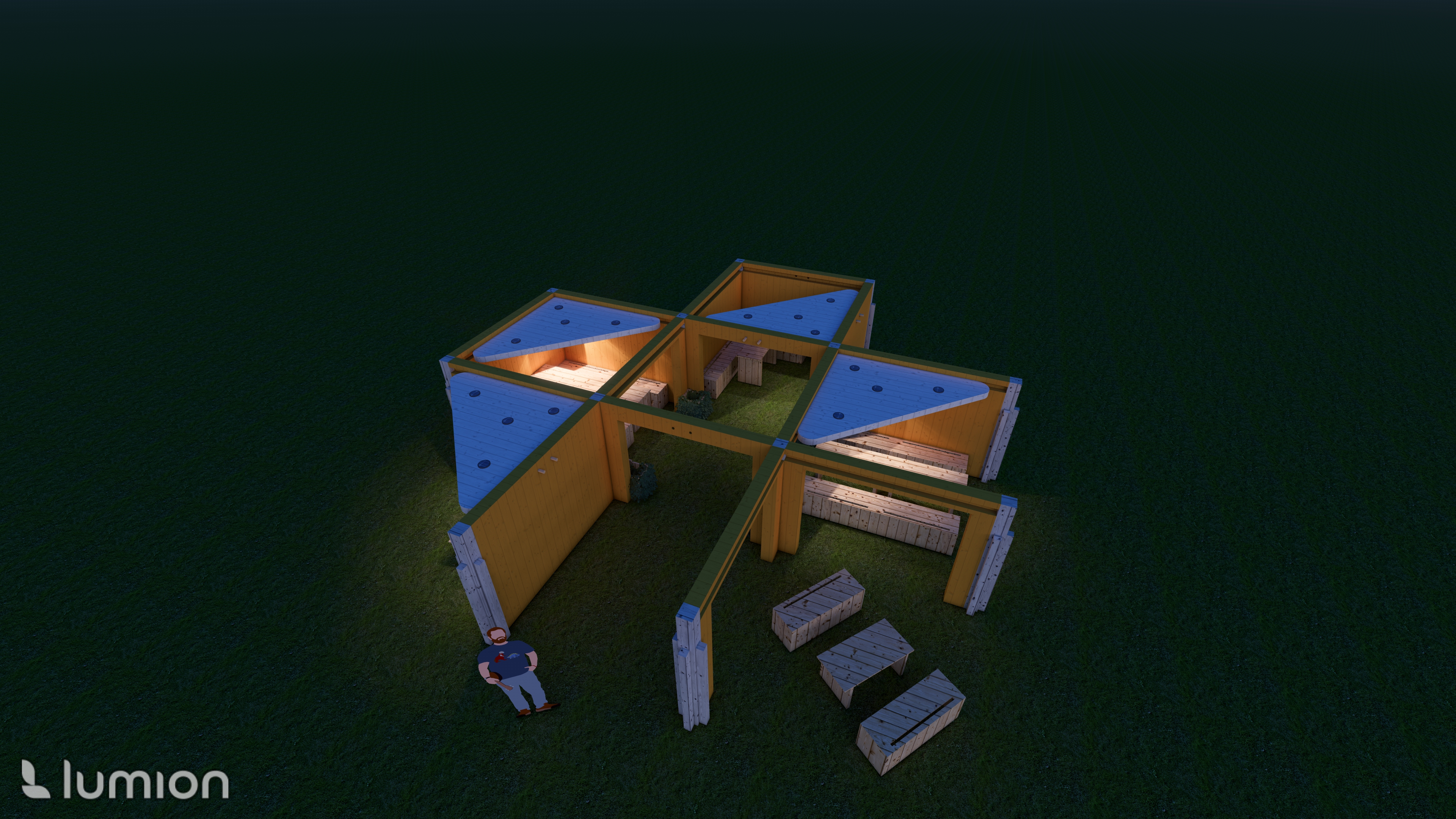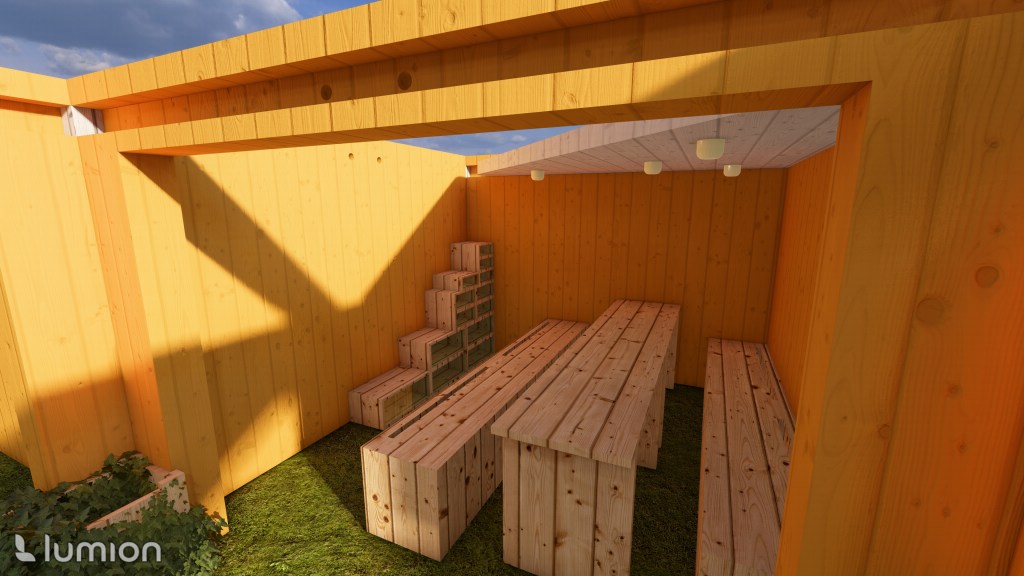 The structure and furniture inside are all fully collapsible into panels so that it can easily be moved between locations.