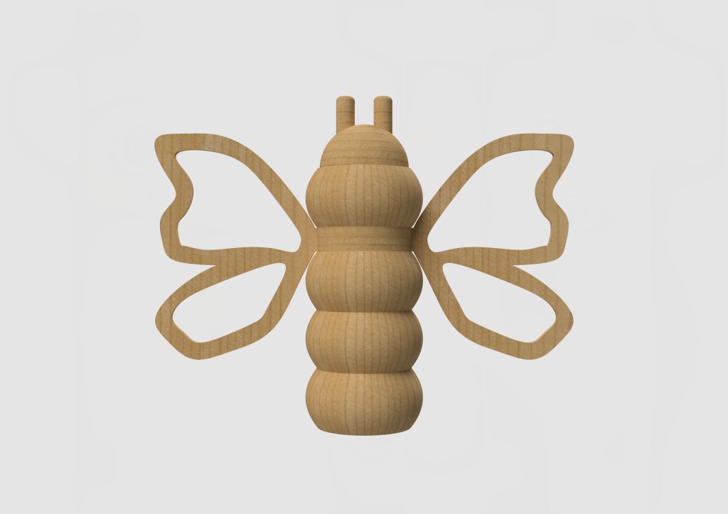 My proposal was a stacking toy aimed at children aged 2-4yrs loosely inspired by the lifecycle of a butterfly. First the child can build the caterpillar by connecting the body segments, and the wings can be added on afterwards to transform it into a butterfly.